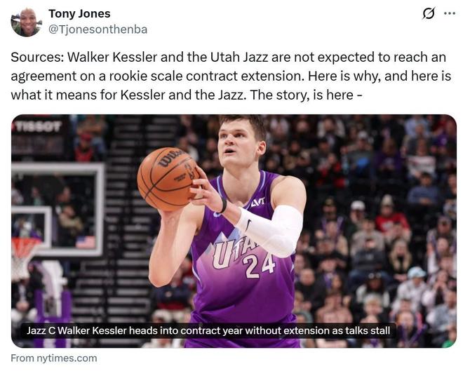 爵士TA队记Tony Jones就在同一天曝出,爵士始终无法与凯斯勒就新秀合同提前续约达成一致,后者预计将在明夏成为受限制自由球员。