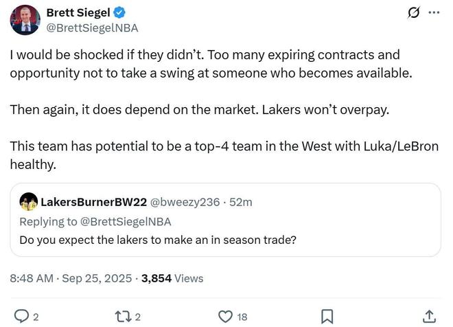 Brett Siegel笃定湖人队会在新赛季完成一些交易操作,如果交易没有发生,自己会感到非常震惊。